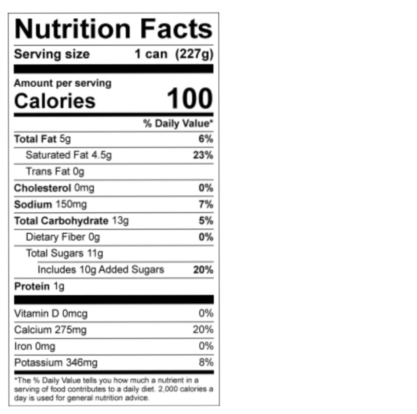 Ingredients: Coffee, Water, Coconut Cream, Sugar, Calcium Carbonate, Potassium Citrate,Gum (gum acacia, gellan gum), Natural Flavor, Salt,Natural Dairy Flavor. Contains Tree Nuts